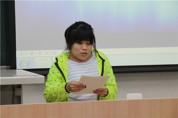 第四位上台发言的同学是优秀宿舍宿舍长陈淑杰同学,她身为宿舍长,能够起到宿舍学习的带头作用,调动起每一位宿舍成员学习的积极性,并且宿舍内部六位同学互帮互助,在自己擅长的学科上多帮助别人,她们能够做到宿舍六个人共同进步、共同向上。