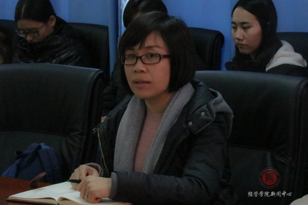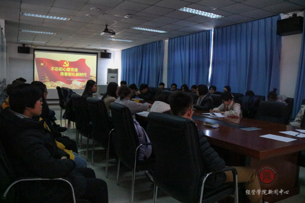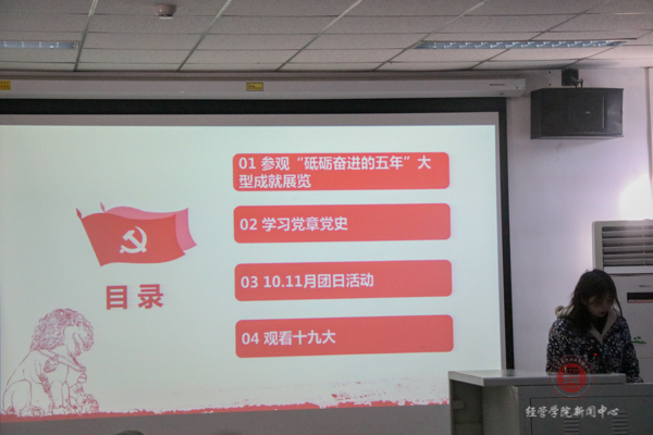 15国贸的团支书温思佳将支部的活动分为学习十九大报告、观看十九大盛况回放、学习新党章、学习心得交流及不忘初心、继续前进五个部分。她摘选了支部两位同学的感受,最后提出了新时代是一个充满机遇和挑战的时代,我们要“不负使命不忘初心继续前进”的号召。与会师生团支书都认真倾听了四位代表的讲话。