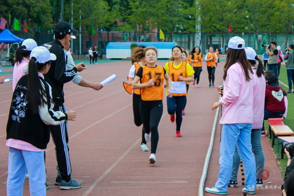 只见运动员们各个屏气凝神,站在各自指定的跑道上,等待着这场速度与耐力的真正较量。“砰”的一声枪响打破了赛场的宁静,她们以百米的速度征服了第一圈,在第二圈,她们虽然露出疲惫的神情,但眼神依然坚定。看台上同学们的加油声如排山倒海般经久不息,主席台上传来的加油稿也表达着同学们对他们最迫切的期盼和最深情的祝福,而这些,都化作成功的助推器,为运动员们增添了无限动力。