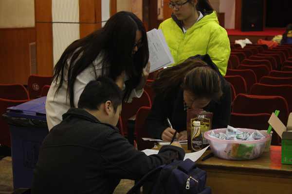 献血体检后,有一些不符合献血标准的同学依旧留在服务台,为献血的同伴加油,同时送上关怀与问候,让爱心温暖着每一位献血者。一股股青春热血,一颗颗爱心满怀,使得每个人都为此次活动中献血的同学感到光荣和自豪。