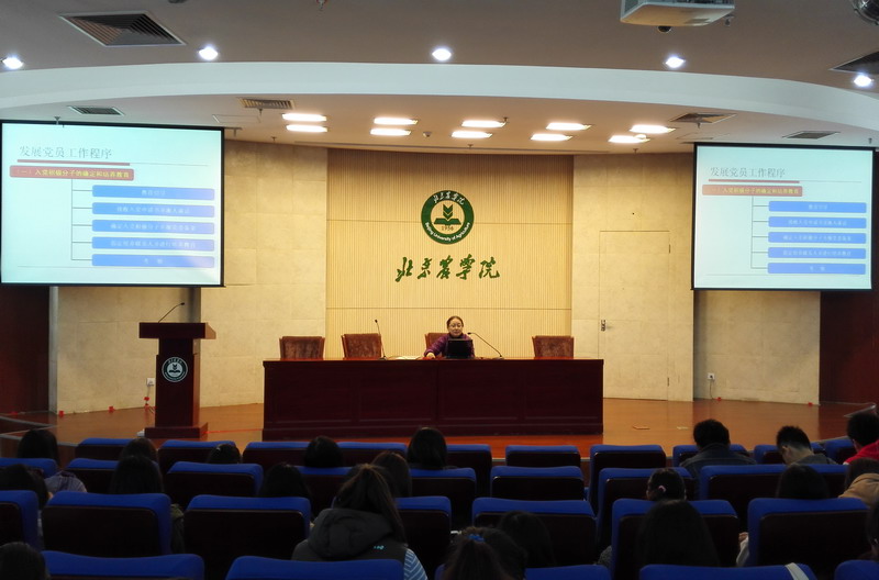 韩宝平部长作了《中国共产党员的标准》的报告,分为两部分,第一部分为了解标准,确立奋斗目标。分别介绍了基本标准、历史标准、具体标准。尤其在,具体标准中提出了培养标准、考察标准、考核标准等。第二部分为明确目标、争取早日加入党组织。分别提出学习理论、坚定信念,牢记宗旨、勇挑重担,艰苦朴素、勤奋好学,严于律己、争做模范四个要求。韩部长讲解清晰,引用大量身边实例,让同学们更加深刻地了解和认识了怎样才是真正的中国共产党员。