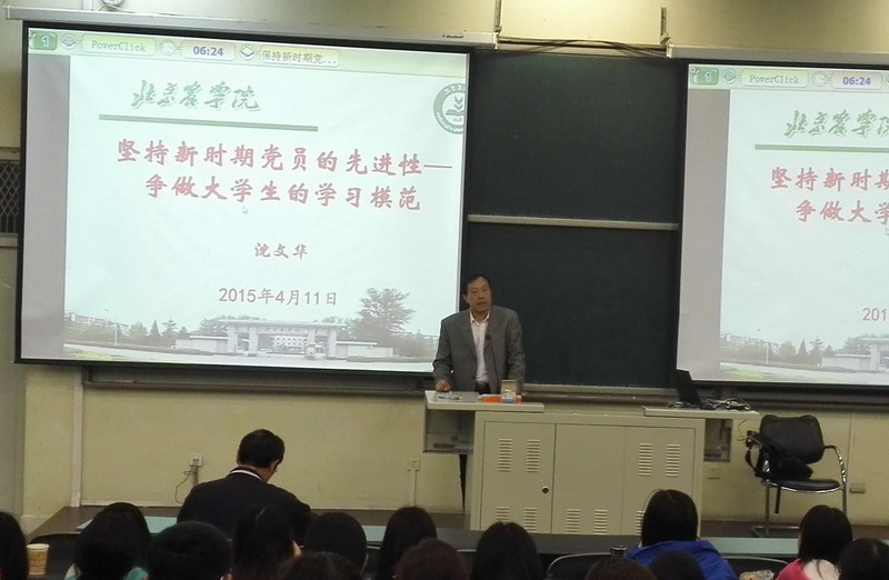 4月11日晚上,沈文华教授作了《坚持新时期党员的先进性——争做老员工的学习模范》的报告。他与同学们做了有关共产党员先进性的互动,并交流了自己的感悟。他从如何理解共产党员的先进性、共产党员先进性所具有的特质和重要表现、员工党员为什么要做学习的模范、员工党员如何做学习的模范四个方面对老员工在新时期作为党员如何保持先进性进行了教育。