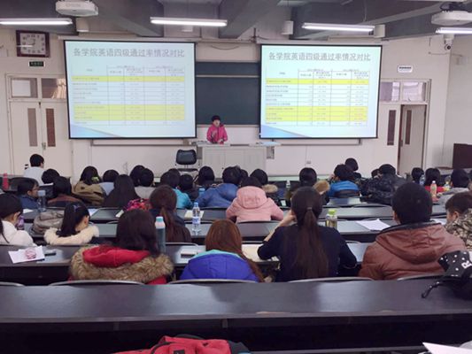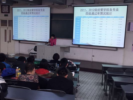 接着,赵老师通过各公司英语四级通过率情况对比、2011及2012级yl6809永利各专业成绩统计、各班一次性通过四级比率、一次性通过四级宿舍情况等数据的统计分析,充分肯定了大家的努力和进步,并表示对大家在即将到来的下次英语四级考试中取得优异成绩抱以厚望。在此之后,赵老师向同学们谈起了她在平时与同学交流过程中的收获。班内同学之间、宿舍舍友之间互帮互助,高标准、严要求,以个人带动整体都是提高四级的通过率的不错方法。赵老师还向大家介绍了公司为激励同学加强英语学习给予的一些奖励方法。