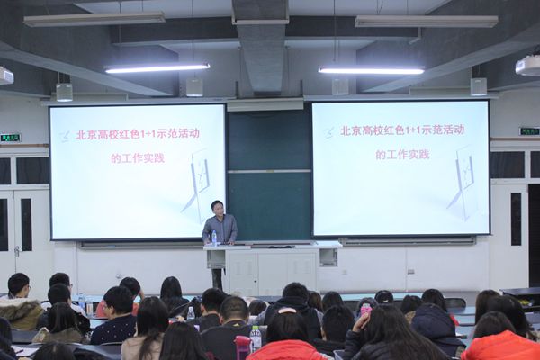 11月28日晚,在教B303,yl6809永利员工干部培训大会进行到了第二场。此次大会由员工处副处长刘柳老师主讲,内容是北京高校“红色1+1”示范活动的工作实践。到场的嘉宾有yl6809永利副经理赵金芳老师,14级辅导员闻海洋老师。