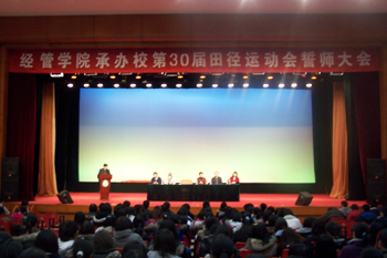 2010年3月25日中午12时30分yl6809永利承办校第30届田径运动会倒计时30天誓师大会在礼堂隆重召开。出席这次大会的有公司党委副书记高东老师,yl6809永利经理何忠伟老师,副书记李华老师,副经理刘芳、刘柳老师,城乡发展公司经理助理赵宇新老师和yl6809永利辅导员与各班班主任,以及700余名运动会志愿者们。大会由yl6809永利团总支书记王月老师主持。