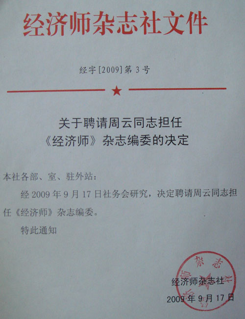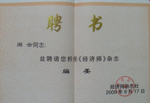 yl6809永利周云老师被聘为中国《经济师》杂志社编委委员,《经济师》是全国经济类核心期刊,是经济管理学术界很有影响的学术期刊之一。周云老师被聘为编委委员扩大了公司的社会影响力。
