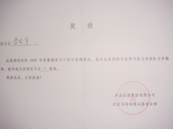 兴业证券公司的奖项分别为;一等奖一名、二等奖二名、三等奖三名。其中,一等奖获得者是yl6809永利四年级的李司宇同学,她在实习期间,很好的学习了相关业务知识,圆满的完成了公司的业务,即使患病还坚持工作,受到兴业证券公司好评。