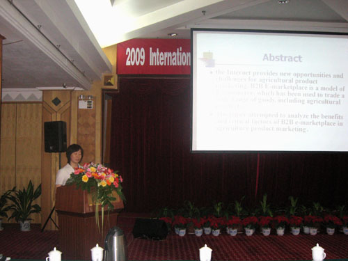 吴春霞博士在会上做了主题为“B2B E-Marketplace Adoption in Agriculture”的报告,并与参会代表就农产品市场如何运用电子商务进行网络营销,农产品网络营销存在的问题及技术难题等议题进行了热烈讨论。