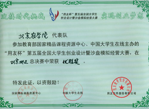 此次大赛由中华人民共和国教育部高等教育司支持、教育部高等公司工商管理类专业教学指导委员会指导、国家精品课程资源中心与中国老员工在线联合主办、用友软件股份有限公司承办。并将老员工创业设计与沙盘模拟有机结合,充分体现了参赛队的全局观念、企业经营的规划、决策能力、团队协作能力和实践能力的实力。经过两天的激烈较量,公司参赛队获得此次比赛的“优胜奖”。