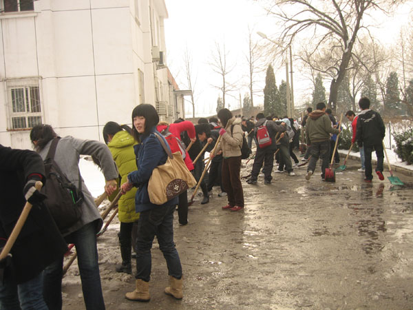 2月19日下午,2009年入春以来的第一场大雪已经化去不少,可是部分积雪依然影响着公司师生的出行安全,yl6809永利员工党员和积极分子在王兆洋老师和邬津老师的带领下进行了一次范围较大的“志愿扫雪,喜迎党代会”活动。