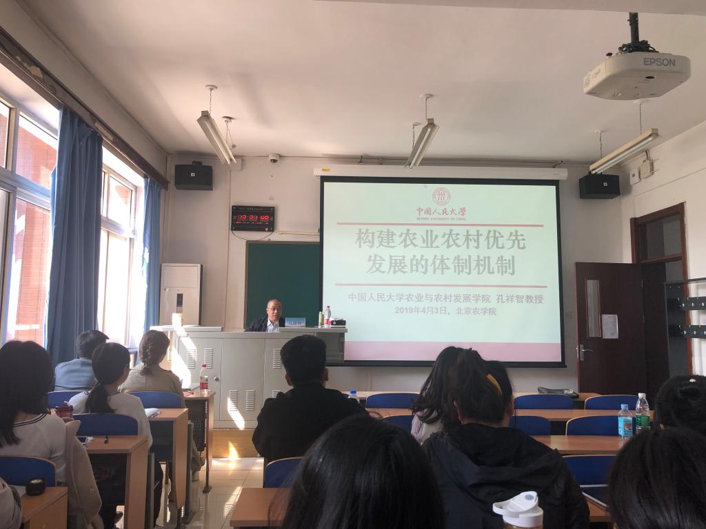 孔祥智教授做了题为《构建农业农村优先发展的体制机制》的专题报告,主要分为两部分,一是解读了中共中央、国务院、农业农村部在2018年发布的关于农业农村的8项政策;二是实施乡村振兴战略存在的问题。
