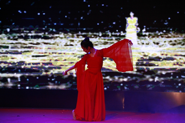 唯美的古典舞《韵》中舞者穿着一袭红衣,挥动红袖伴随着飞扬的舞步,使得台下观众沉浸在其优美的舞中。