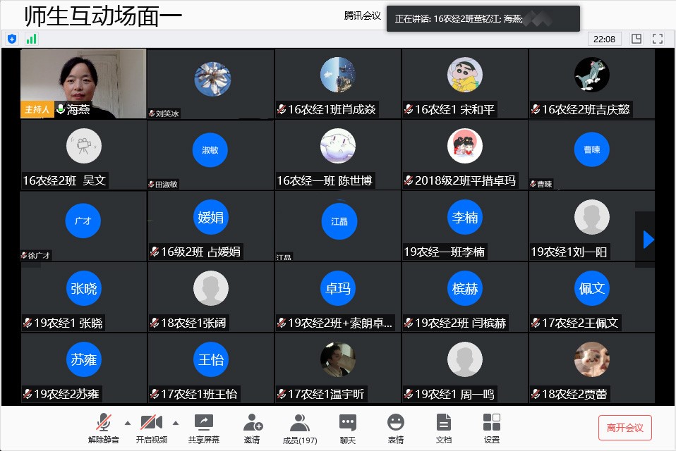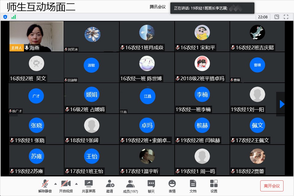 随后,在师生互动环节,同学们就目前关心的问题如何时开学、期末考试安排、军训安排、开学的防控措施等提问,参会老师们予以了耐心解答,并告诉同学们静待花开,相关安排需要安心等待公司和公司的具体布置,同时公司一直严格按照教育部等上级指示和要求,严格做好防控各方面安全保护措施。之后,各班班长代表每班进行了近期情况的汇报,16级同学们在忙毕业论文,目前到了论文查重阶段,同学们论文的查重率整体较低,符合要求,同时同学们也都在主动与导师联系;就业方面,部分同学已经拿到offer;考研上线的同学正在准备复试。17级同学整体上课情况良好,日期系里已带大家进行了导师分组,同学们进入到毕业论文选题准备环节。18级同学整体上课情况也较好,最近在着手准备一些课程的结业考试等。19级同学作为大一新生,目前已经步入大学学习状态,学习努力,积极向上。同学们纷纷表示,在居家学习期间,系里召开全体员工线上交流会,给同学们送来公司、公司和系里问候,大家都很感动、开心和感谢!