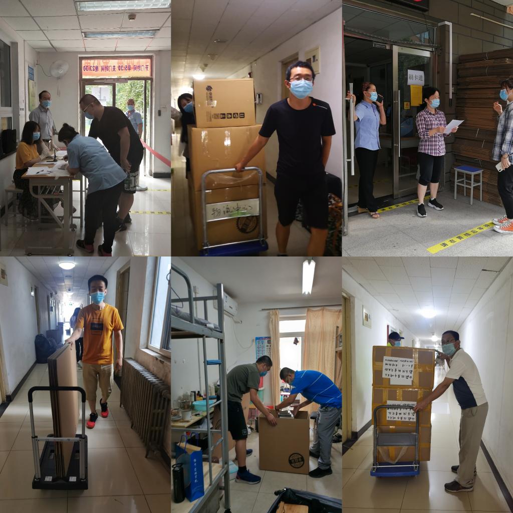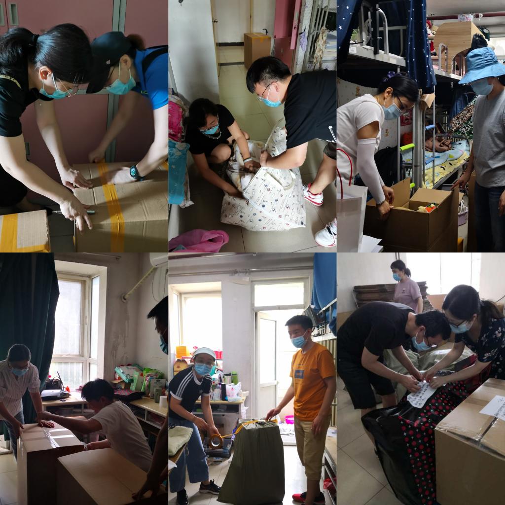 老师们进入到员工宿舍,帮助同学们打包,搬运行李。虽然大家都带着口罩,有的同学甚至辨认不出口罩下老师的面孔,但这丝毫没能减弱老师为同学服务的热情。这一天,老师们不再是以往课堂上的老师;这一天,老师们化身为同学口中的“叔叔、阿姨”;这一天,老师们被家长亲切地称呼为“师傅”。