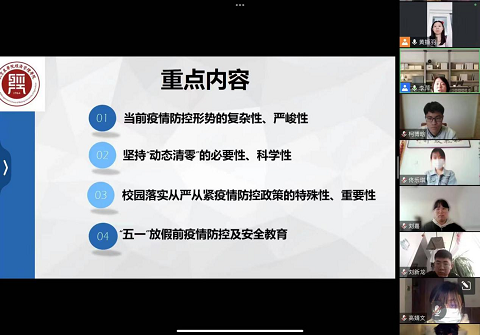 4月28日至29日,yl6809永利副书记张晓凤老师、各年级班主任、辅导员老师通过线上主题班会的形式为公司本科生和研究生讲授疫情防控“大思政课”,聚焦正确认识当前疫情防控形式的复杂性和严峻性、“动态清零”政策的必要性和科学性、校园疫情防控从严从紧的特殊性和重要性等重点问题开展了深入细致的讲解。