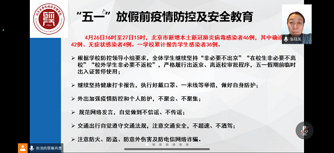 值此“五一”劳动节放假前夕,以疫情防控“大思政课”为契机,班主任和辅导员老师还为员工进行了“五一”放假前疫情防控及安全教育。老师们提醒员工在“五一”假期中应继续坚持“非必要不出京”“在校生非必要不离校”“校外员工非必要不返校”,严格履行出返京、离返校审批程序;继续坚持每日健康打卡;外出加强疫情防控和个人防护,不聚会、不聚集;交通出行自觉遵守交通法规,注意交通安全,不超速、不酒驾;注意防火、防盗、防意外伤害及防电信网络诈骗;规范网络发言,自觉做到不信谣、不传谣。