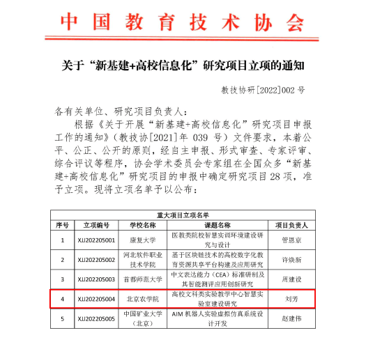 根据中国教育技术协会《关于“新基建+高校信息化”研究项目立项的通知》(教技协研[2022]002号),yl6809永利刘芳教授的项目“高校文科类实验教学中心智慧实验室建设研究”获“新基建+高校信息化”重大项目立项。
