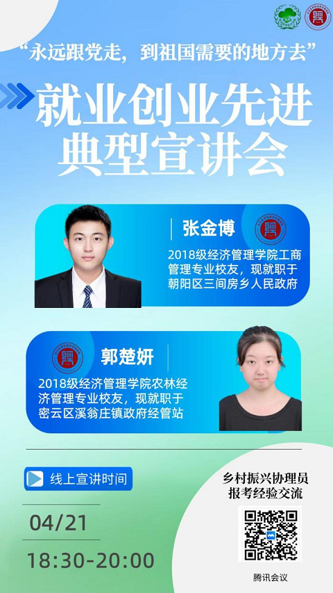4月21日,yl6809永利利用员工优势,邀请任职“乡村振兴协理员”的员工举办了“永远跟党走,到祖国需要的地方去”乡村振兴协理员线上分享交流会。为yl6809永利和植物科学技术公司毕业生们分享报考经验、工作内容、发展前景,鼓励北农毕业生在乡村振兴领域发光发热。