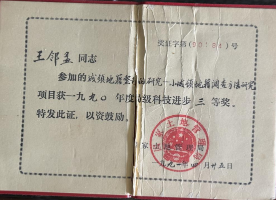 王邻孟教授获得1990年国家土地管理局科技进步三等奖