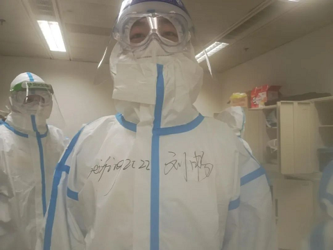 与志愿者小伙伴们共同上岗的经历,让刘畅感受到了家的温暖。在上岗前,刘畅与伙伴们都会很默契地主动为彼此检查防护服穿戴情况,也会很细心地帮彼此缠胶带、写名字,“互帮互助,团结友爱”成为了这个团队的名词。他说:“下岗后我们会按照流程科学地脱下防护服,但大家的头发经常会被防护服压得变型,脸上也经常会被护目镜和N95口罩勒出一道道印记,所以在下岗后我们经常会彼此‘嘲笑’对方脱下防护服的狼狈样子。”脸上被勒出的一道道印记和被防护服压扁的头发是这群志愿者青春最美好的模样,那一声声对彼此狼狈样子的“嘲笑”也是他们青春最珍贵的回忆。
