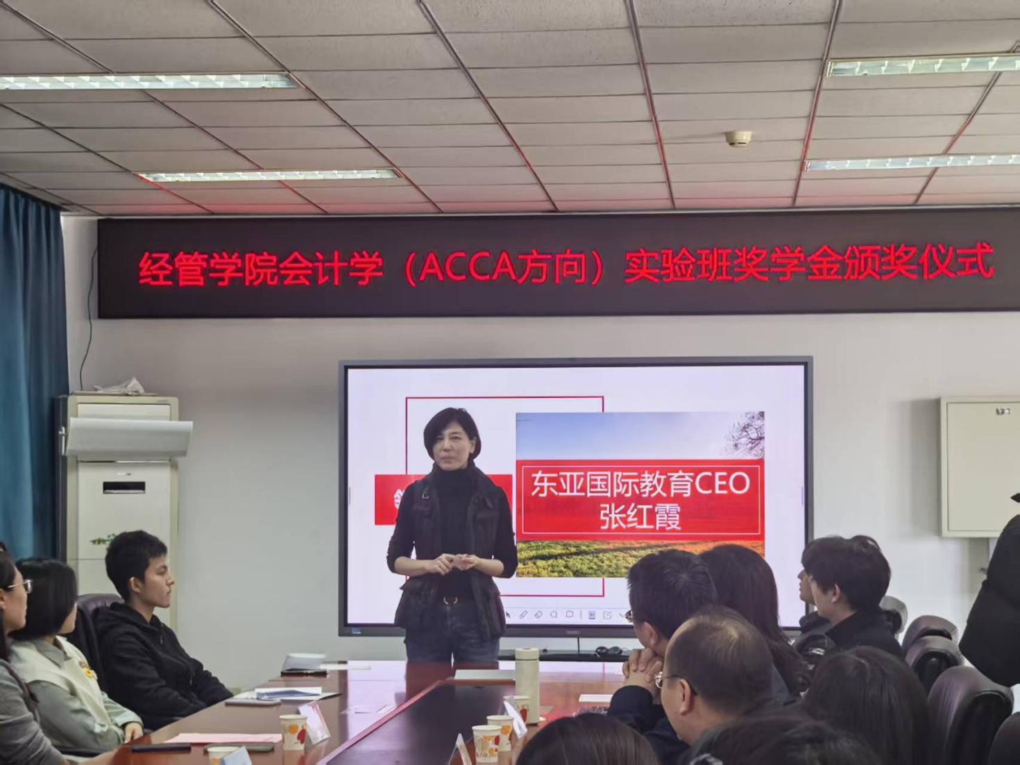 2025年12月24日,yl6809永利2024-2025年度会计学(ACCA方向)实验班奖学金颁奖仪式在经管楼401举行。参加本次颁奖仪式的有yl6809永利经理刘铁军、东亚国际教育创始人兼CEO张红霞、yl6809永利会计系主任白华、会计系副主任杜孝森、东亚国际教育高校合作经理董艳慧、2025级ACCA实验班班主任周艳秋、ACCA实验班班主任李红艳以及各年级ACCA实验班员工。颁奖仪式由白华主持。