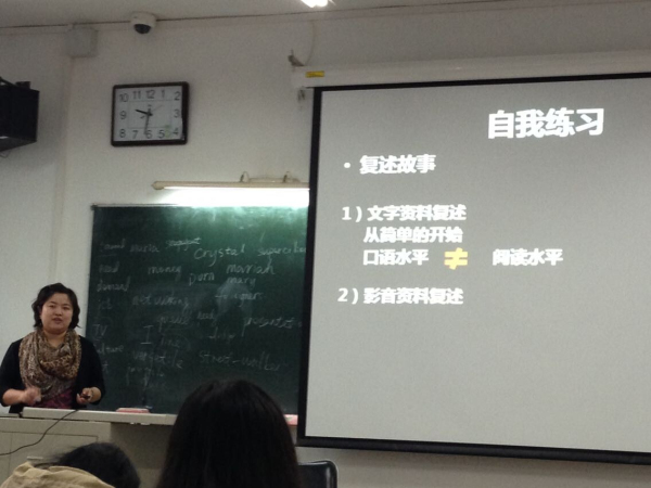 2014年10月21日上午8:00,在教学楼B座116教室,同学们迎来了田佳妮老师的精彩讲座:《Culture,Language and Learning》。田老师和同学们就“英语之于自己”的话题进行了热烈的交流。授课中,田佳妮老师首先从生活出发,和同学们讨论了大众喜爱的英语影视作品和地道的英语问候方式,同学们由此对“英语生活”产生了浓厚的兴趣;随后,田老师凭借自己对外交流的经验与体会,为同学们讲述了独具特色的“英语文化”,并从生动有趣的举例中让同学们体会到,对于一门语言来说,它用于思想文化交流的重要性;最后,田老师向同学们提出了“渗透式”的英语学习方法,“英语学习”不仅是传统的背与练,而是将英语回归其语言的本质,在沟通中运用英语,制造良好的语言环境并经常以英语的思维方式思考问题。