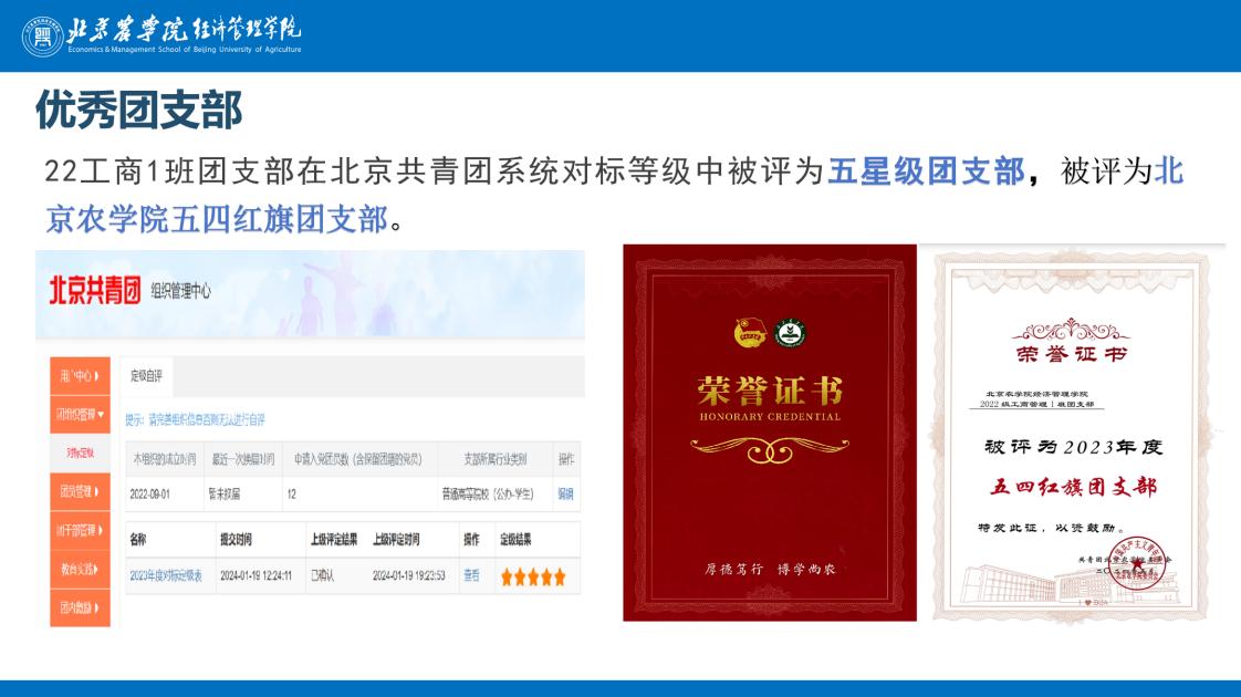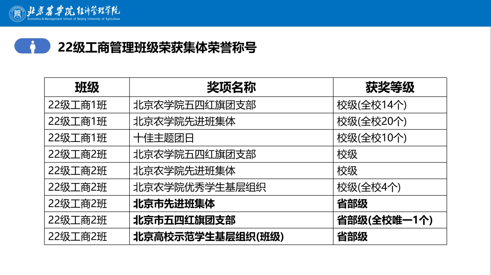 在全体同学的共同努力下,班级建设荣誉满载。截至目前,2022级工商管理专业共荣获包括“北京市先进班集体”、“北京市五四红旗团支部”和“北京高校示范员工基层组织”在内的3项市级荣誉,以及6项校级班集体荣誉。这些沉甸甸的荣誉,属于每一位为之奋斗的同学。